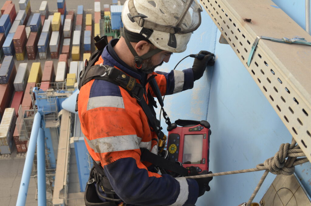 Recherche des déformations, fissures, ruptures de renforts et tout défaut visible. En cas de doute sur la présence d’une fissure, réalisation de contrôles non destructifs (ACFM et/ou Magnétoscopie).